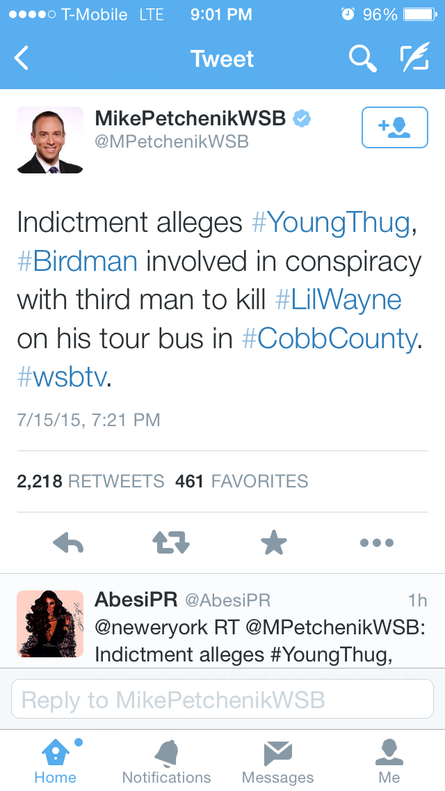 Late Wednesday night an Atlanta reporter SHOCKED the hip hop community with a series of tweets!! According to Mike Petchenik of WSB-TV Young Thug and Baby of Cash Money Records and another man conspired to KILL Lil Wayne…