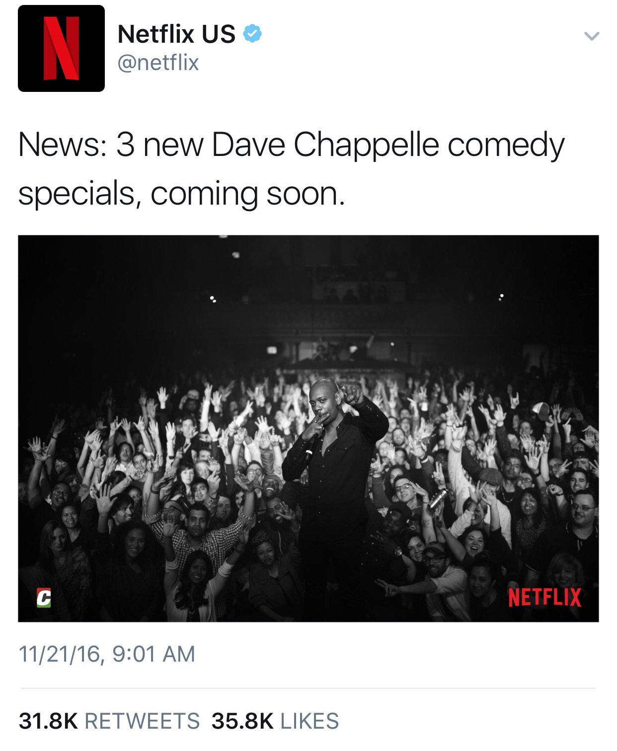 November 22, 2016 Chappelle Heading To Netflix This tweet went out yesterday and as you can see… 30K+ retweets and 30K+ likes! This coming off Chappelle’s amazing showing on SNL 2 weeks ago! Stick to the website for when the specials will drop! Share this: Share on X (Opens in new window) X Share on Facebook (Opens in new window) Facebook Like Loading...