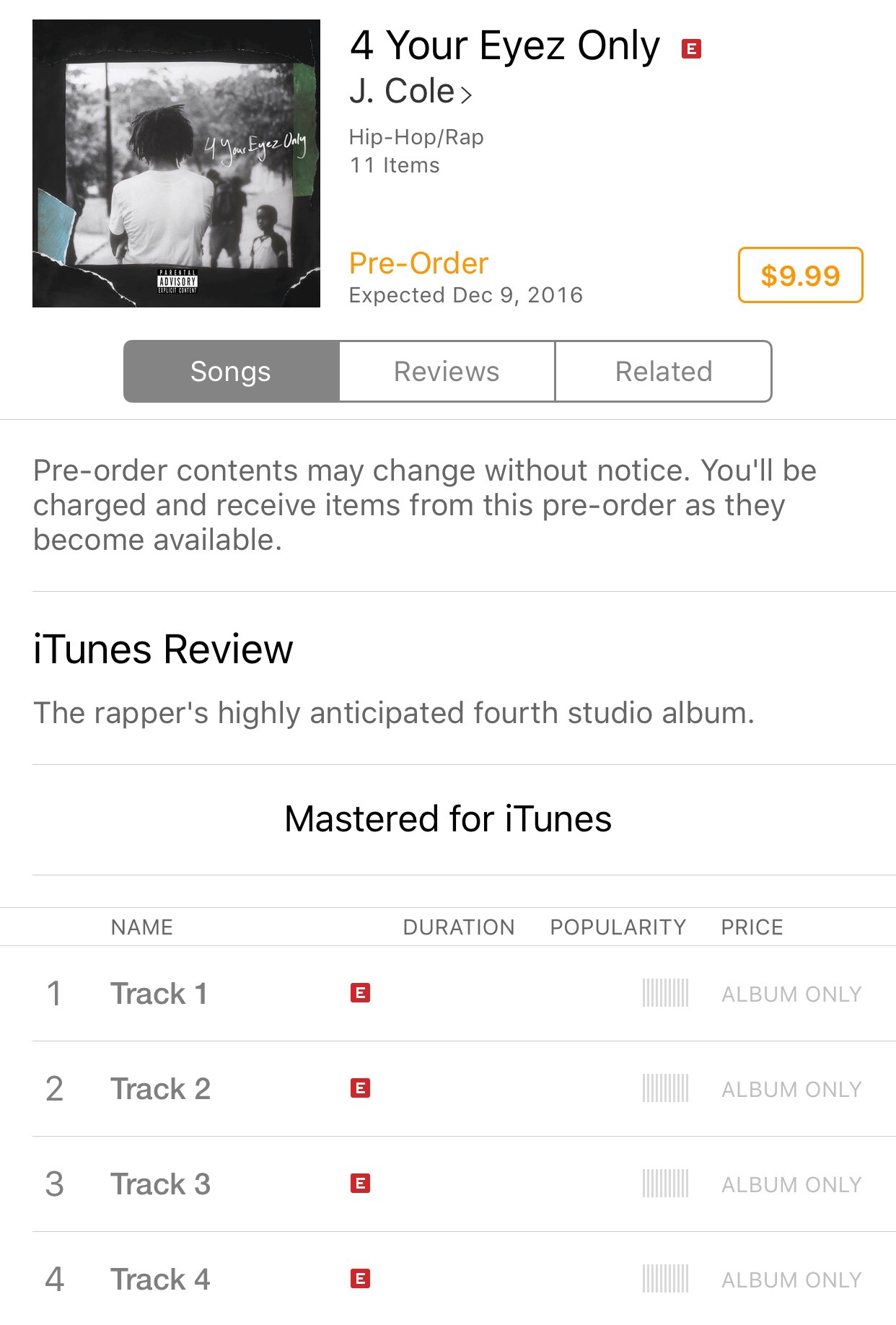 December 1, 2016 J Cole New Album If you hop in your ITunes Store right now you will see the pre order for Cole’s new album ‘4 Your Eyez Only’ available 12/9! Share this: Share on X (Opens in new window) X Share on Facebook (Opens in new window) Facebook Like Loading...