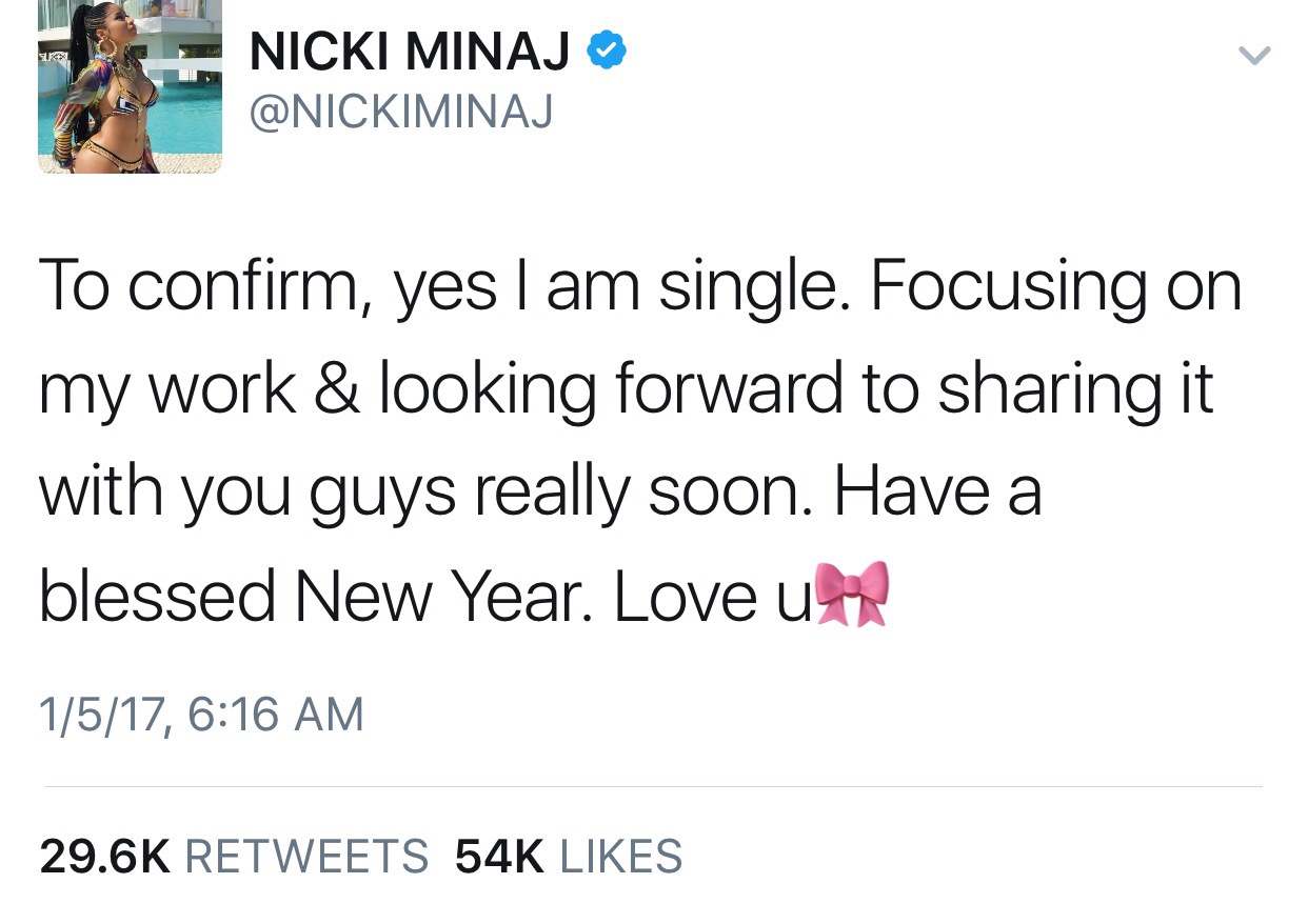 January 5, 2017 Nicki Meek DONE Rumors were swirling that Meek Mill and Nicki Minaj were having some issues… Well a tweet from Nicki this morning put an end to things… The rappers started dating back in 2015. so who do you think the first person was to slide in her DMs? Share this: Share on X (Opens in new window) X Share on Facebook (Opens in new window) Facebook Like Loading...