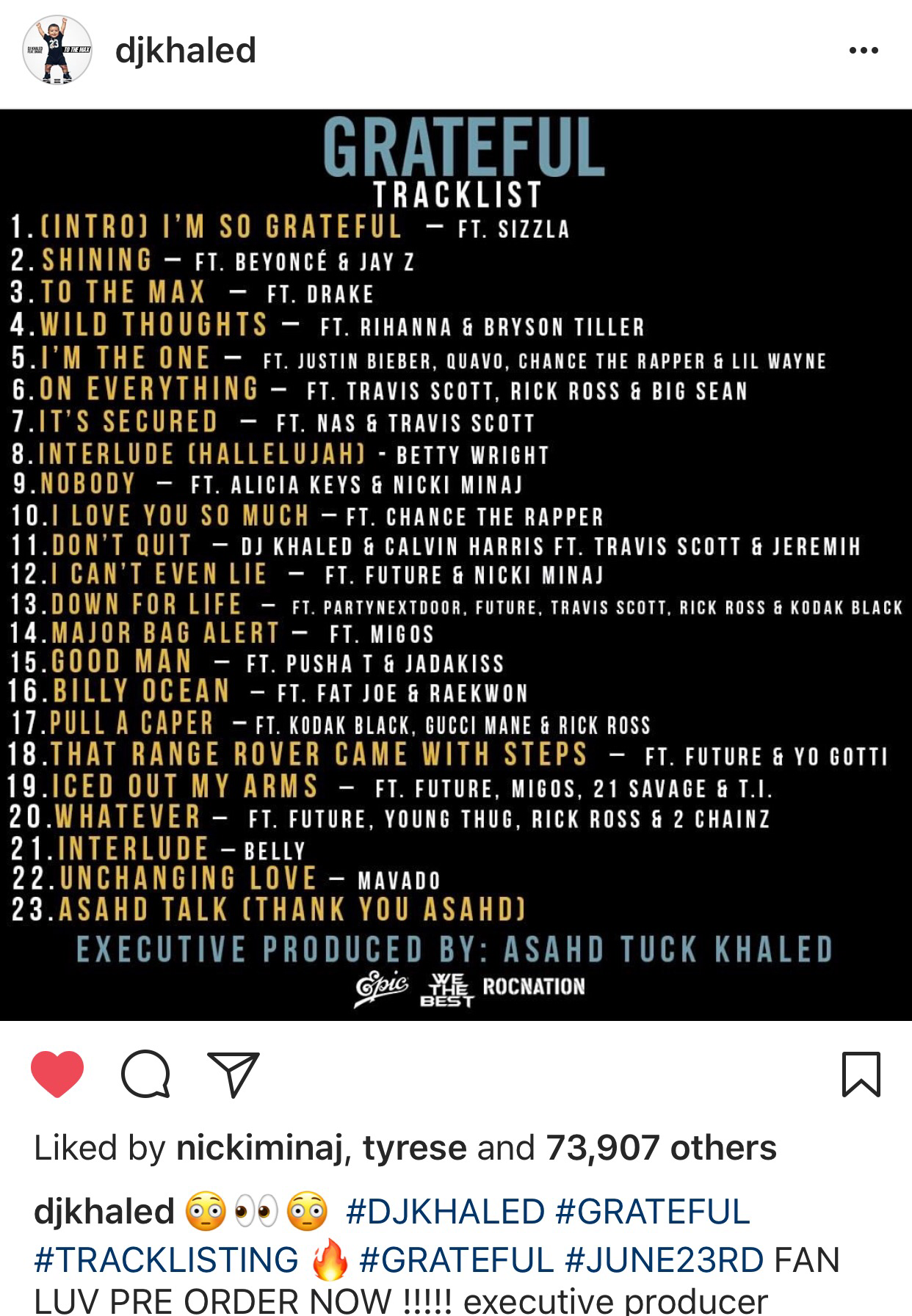June 9, 2017 Grateful Tracklist Revealed It’s one of the most anticipated albums of the summer… DJ Khaled just unveiled the track list for ‘Grateful’! Which feature are you most excited about? Share this: Share on X (Opens in new window) X Share on Facebook (Opens in new window) Facebook Like Loading...